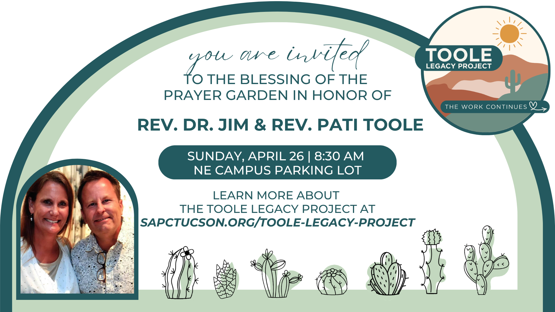 The Toole Legacy Fund was formed to honor the life and impact of the Rev. Dr. Jim and Rev. Pati Toole by creating healing spaces that reflect their commitment to God’s love and service. Through three key initiatives – a Prayer Garden, a Mosaic Project, and a Mental Health Fund – we aim to foster spiritual wellness, creativity, and mental health support for the community. These projects aim to continue the Toole’s legacy of nurturing faith, healing, and connection for generations to come. If you would like to learn more about how you can support these projects please go to: sapctucson.org/toole-legacy-project